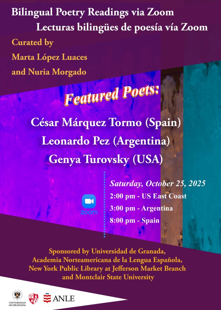 Mark your calendars for October 25th! The next event in the online Bilingual Poetry Series, curated by Cable Street contributor Marta López Luaces, will be held on Saturday October 25 at 2PM Eastern (US) Time. The poets at these events are sublime, as is the collegial, bilingual atmosphere. Join at this Invite Link: https://montclair.zoom.us/j/94413863794