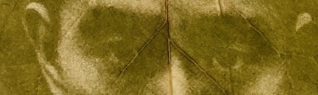 Using an old process of chlorophyll printing, I print the image onto acetate and overlay this on the leaf. It is then sandwiched between glass panels and placed in direct contact with sunlight.