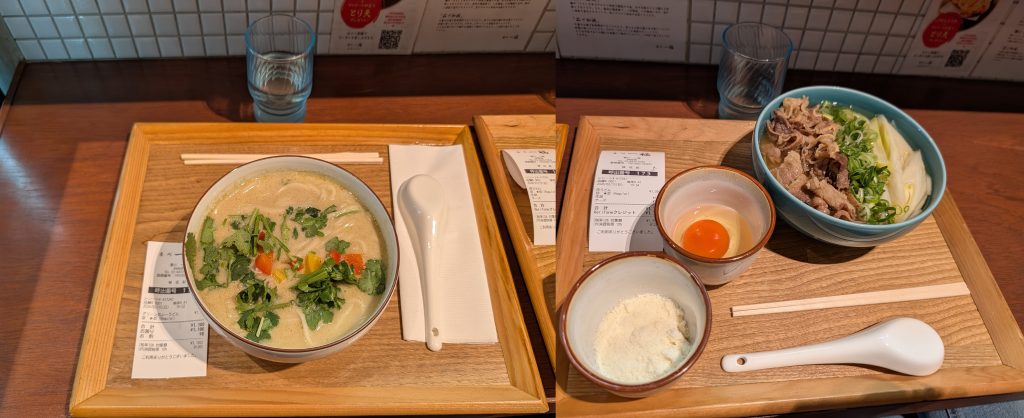 We started eating, making sure to slurp. The cilantro, curry, and peppers in mine made for a very different, wonderful bowl of light spice and green flavors. Talya’s was almost the opposite, with lots of mouth feel from the daikon and slowly-cooking egg.