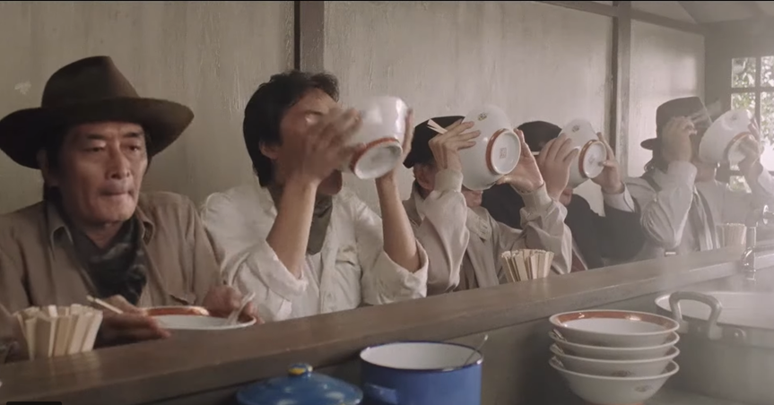 On the far left in this picture, Ken Watanabe is the truck driver Gorō, and Tsutomu Yamazaki as his assistant, Gun, is just about to put his bowl down.